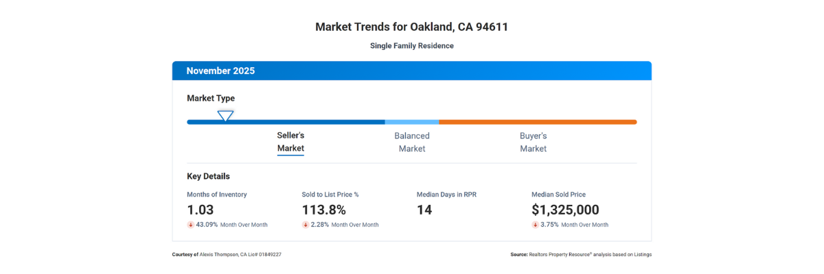In Oakland 94611, the single-family home market remains intensely competitive despite modest price softening. Inventory has tightened dramatically to just 1.03 months of supply, down sharply both month-over-month and year-over-year, reinforcing strong seller leverage. While the median sold price dipped slightly to $1.33M, competition remains fierce, with homes selling at an average of 113.76% of list price. The median days on market held steady at 14 days, signaling sustained buyer urgency. With 29 pending sales compared to only 13 new listings, demand continues to significantly outpace new inventory—particularly for well-positioned homes.
